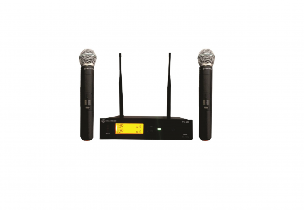 میکروفن وایرلس دو دستی chairman دارای کارکرد در باند فرکانسی VHF می باشد. این میکروفن بی سیم با کمترین میزان قطعی، نویز و افت کیفیت صدا دارای برد تا 50 متر می باشد و امکان اتصال به میکسر، اکو همراه ، پاورمیکسر ، کامپیوتر، آمپلی پیجینگ ، دستگاه پخش خانگی (سینما خانواده) و … را دارد. وجود ولوم کنترل برروی گیرنده که می توان با استفاده از آن حجم صدای دریافتی را تغییر داد از دیگر ویژگی های این محصول می باشد. کارکرد میکروفن با باطری و کارکرد گیرنده با برق شهر (آداپتور) می باشد. نمونه اصلی این میکروفن که توسط شرکت اکوتک توزیع می شود دارای بسته بندی سفید می باشد.